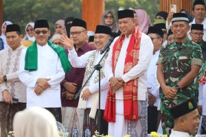 Sebelumnya bersama Wali Kota Bekasi Tri Adhianto, Wakil Wali Kota Abdul Harris Bobihoe menyambut rombongan kirab santri dipanggung kehormatan. (Dokpim/Mul/Adv)