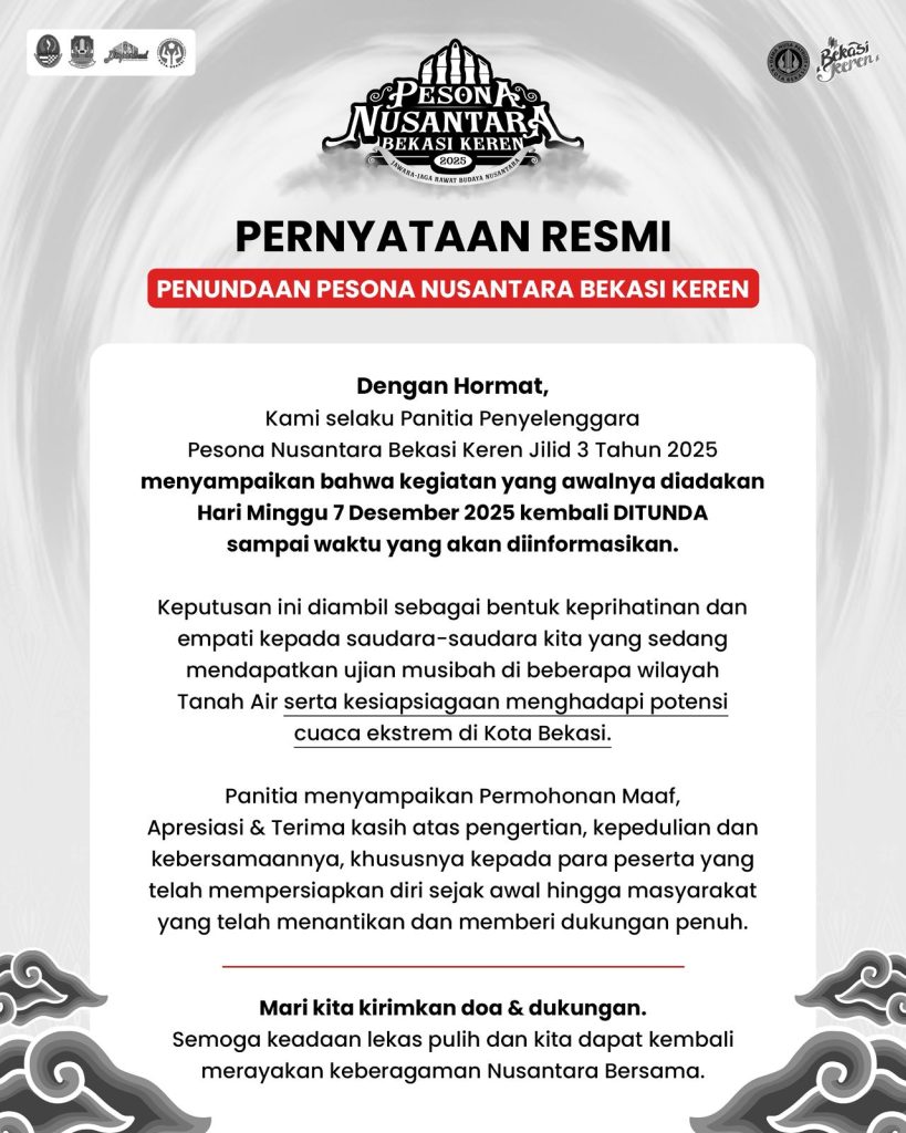 Kota Bekasi, Media-krimsuskum.com — Pemerintah Kota Bekasi melalui Dinas Pariwisata dan Budaya resmi menyampaikan bahwa Pesona Nusantara Bekasi Keren (PNBK) Jilid 3 Tahun 2025, yang semula dijadwalkan berlangsung pada Minggu, 7 Desember 2025, ditunda hingga waktu yang akan ditentukan kemudian. Keputusan ini diambil sebagai bentuk empati atas kondisi keprihatinan yang sedang melanda sejumlah wilayah di Tanah Air, sekaligus langkah kesiapsiagaan menghadapi potensi cuaca ekstrem di Kota Bekasi.