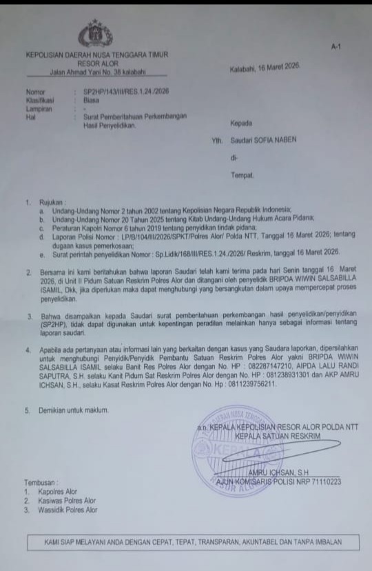 Laporan korban telah diterima oleh Kepolisian Negara Republik Indonesia melalui Polres Alor NTT dan saat ini tengah dalam proses penyelidikan. Hal ini dibuktikan dengan diterbitkannya Surat Pemberitahuan Perkembangan Hasil Penyelidikan (SP2HP) tertanggal 16 Maret 2026.